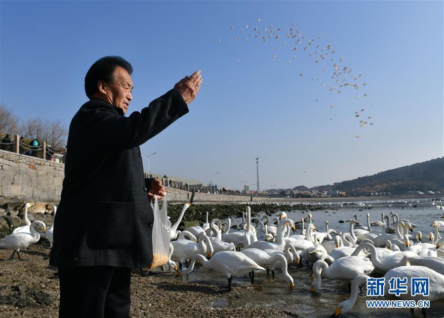 保护大天鹅30多年的村民曲荣学定时给大天鹅喂食(1月23日摄)。 位于山东半岛东端的荣成市烟墩角村海湾生态宜人,每年11月到次年3月,都有近千只大天鹅从西伯利亚等地飞来越冬。近年来,随着大天鹅国家级自然保护区的设立和当地村民生态保护意识的提高,来此越冬的大天鹅数量逐年增多,荣成已经成为知名的大天鹅越冬栖息地。 新华社记者 朱峥 摄