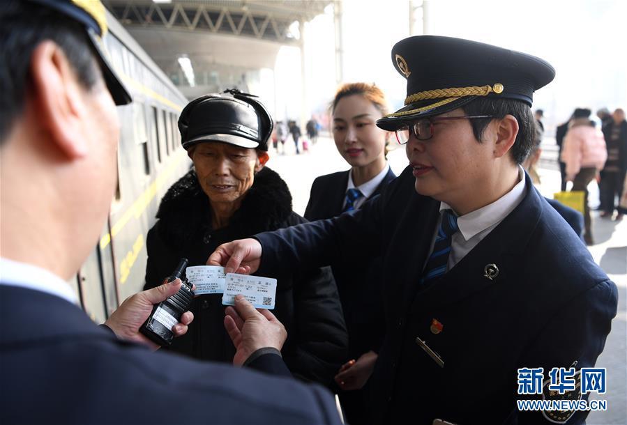 1月23日,刘凤敏(右一)带着徒弟协助重点旅客进站乘车。