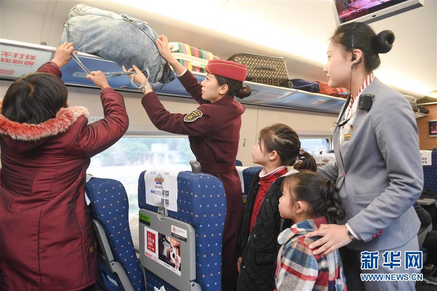1月24日,在重庆开往福州的G1755次列车上,乘务员帮助一位带着两个孙女前往福建的老人放置行李。