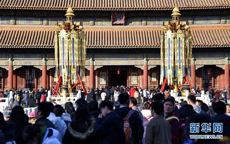 1月25日,游人在故宫内参观游览。 春节将至,北京故宫博物院内张灯结彩,到处悬挂着宫灯、万寿灯、年画、门神、福字等古代宫廷节日装饰品,让来自国内外的游人感受到浓浓的年味。 新华社记者 李欣摄