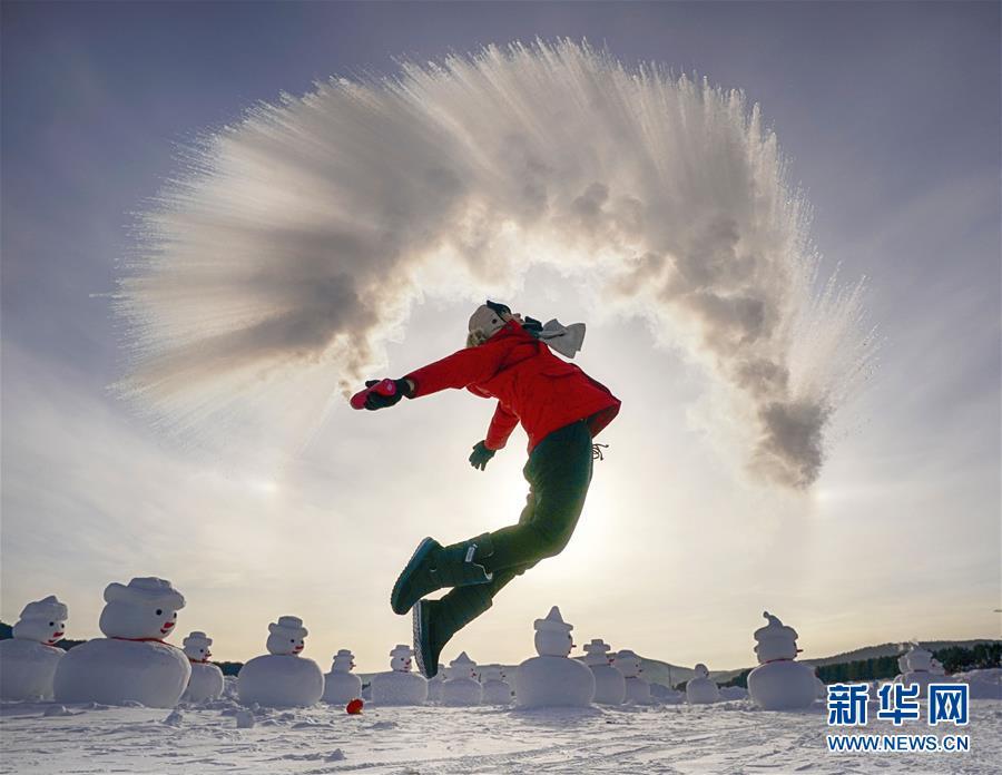 1月24日,在黑龙江省漠河市北极村,游客体验“泼水成冰”游戏。 新华社记者才扬摄
