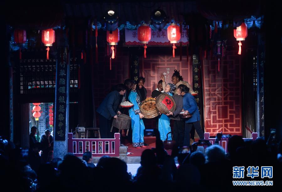 1月27日,外国友人和村民在观看“国际村晚”上的越剧表演。 新华社记者 黄宗治 摄