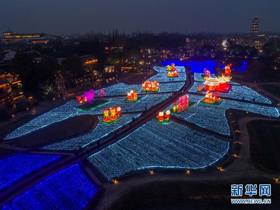 1月28日无人机拍摄的乌镇景区内的龙腾盛世彩灯。新华社记者 徐昱 摄