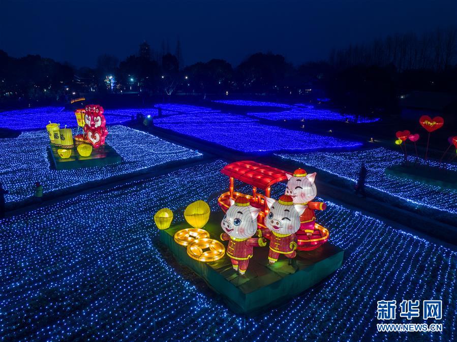 1月28日无人机拍摄的乌镇景区内的金猪闹春彩灯。新华社记者 徐昱 摄