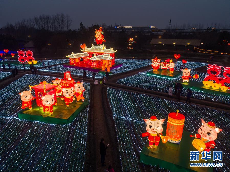 1月28日无人机拍摄的乌镇景区内的彩灯。新华社记者 徐昱 摄