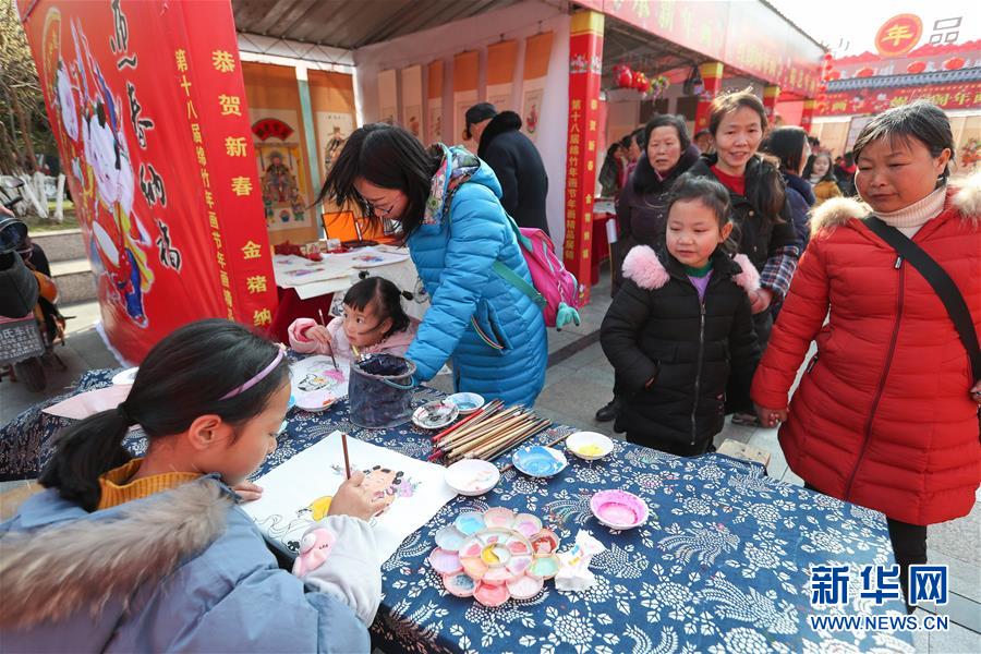 1月28日,在四川省绵竹市中心广场上,小朋友体验绵竹年画着色。