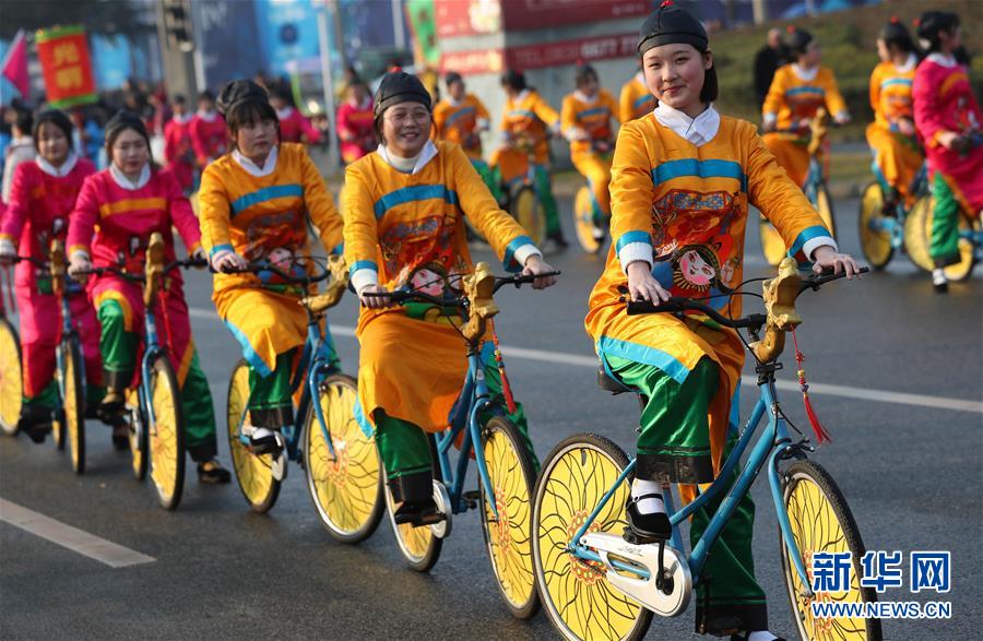 1月28日,在四川省绵竹市苏绵大道上,市民再现经典的传统绵竹年画《仕女骑游》的故事情节。新华社记者 江宏景 摄