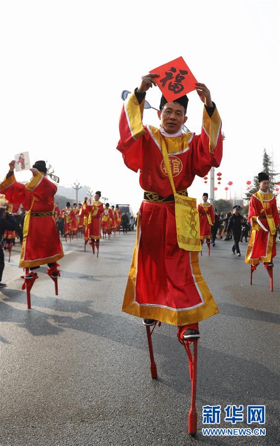 1月28日,在四川省绵竹市苏绵大道上,踩着高跷的“春官”准备为群众送福字和年画。 新华社记者 江宏景 摄