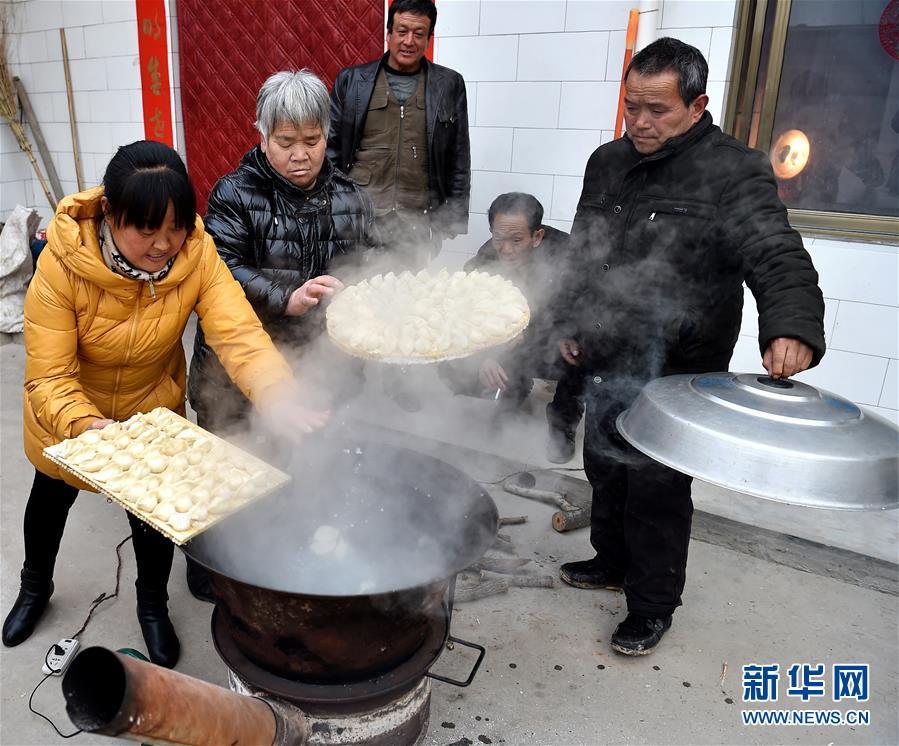 1月28日,在闻喜县张才岭村“幸福小院”,村民将包好的饺子下锅。 新华社记者 詹彦 摄