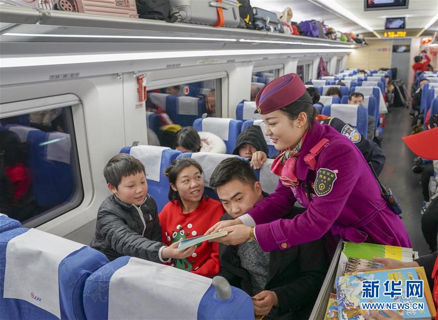 1月29日,G2883次列车长严攀(右一)向旅客推荐动车流动书屋的书籍。 新华社记者 刘潺 摄