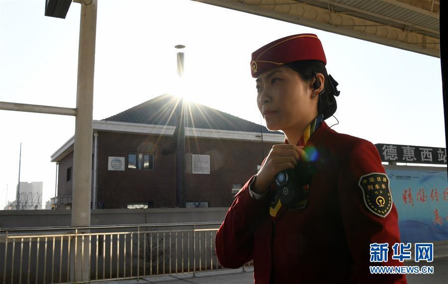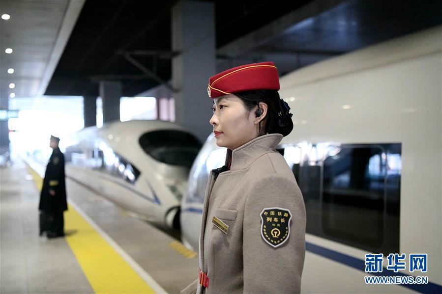 在哈尔滨西站,张悦在发车前准备迎接旅客(1月30日摄)。 新华社记者王松摄