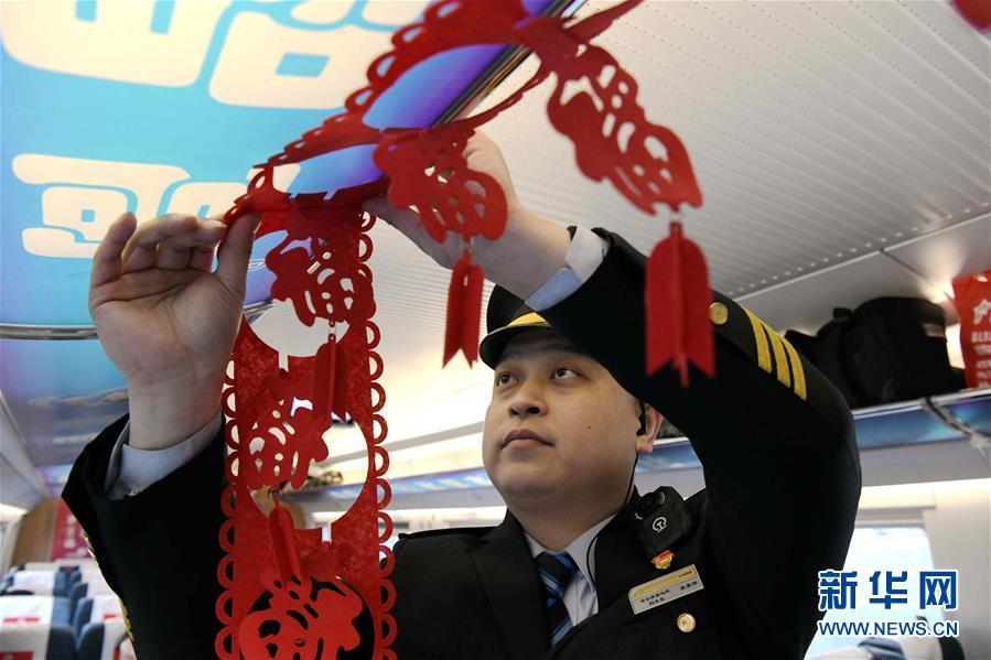 在G1206次高铁列车上,张嘉祥在布置春节挂饰(1月30日摄)。 新华社记者王松摄