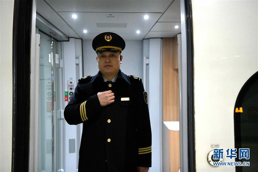 在哈尔滨西站,张嘉祥呼叫前列列车长张悦(1月30日摄)。 新华社记者王松摄