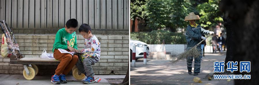 拼版照片:左图为陈俊宁(右)和陈俊言在妈妈的工具房旁看书;右图为周祝在路边打扫卫生(1月30日摄)。