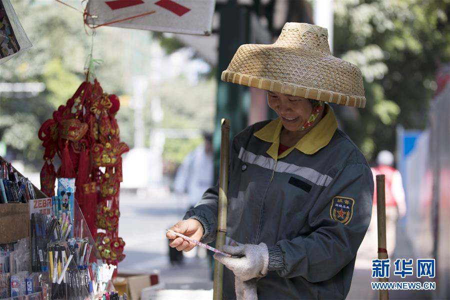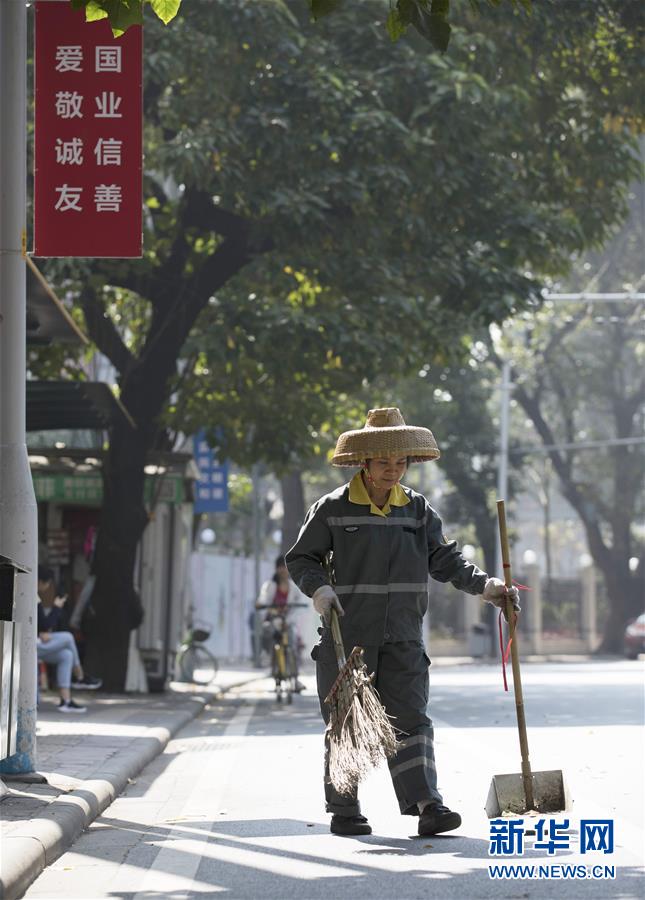 周祝在广州市越秀区起义路上打扫卫生(1月30日摄)。新华社记者田建川摄