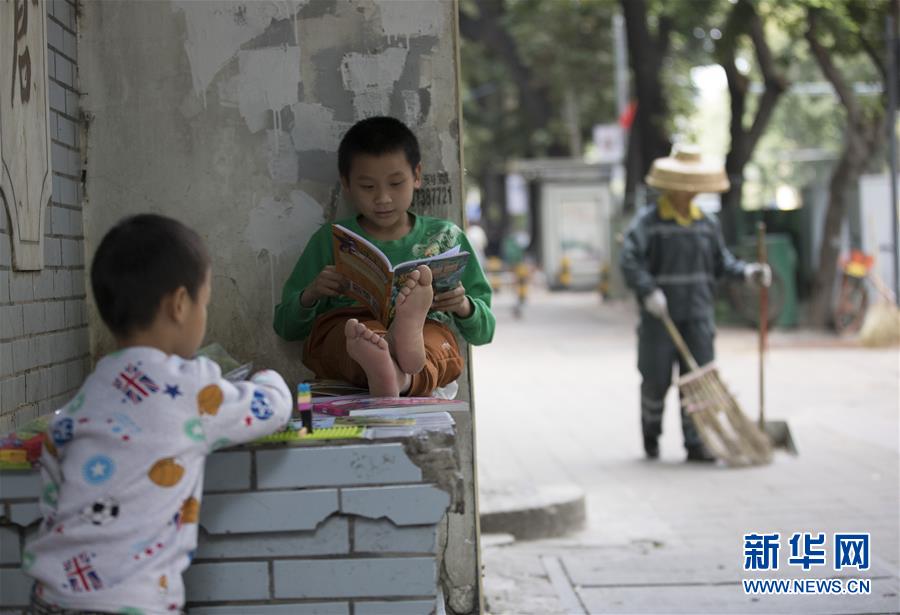 兄弟俩在路边看书时,妈妈在旁边的街道上打扫卫生(1月30日摄)。 新华社记者田建川摄