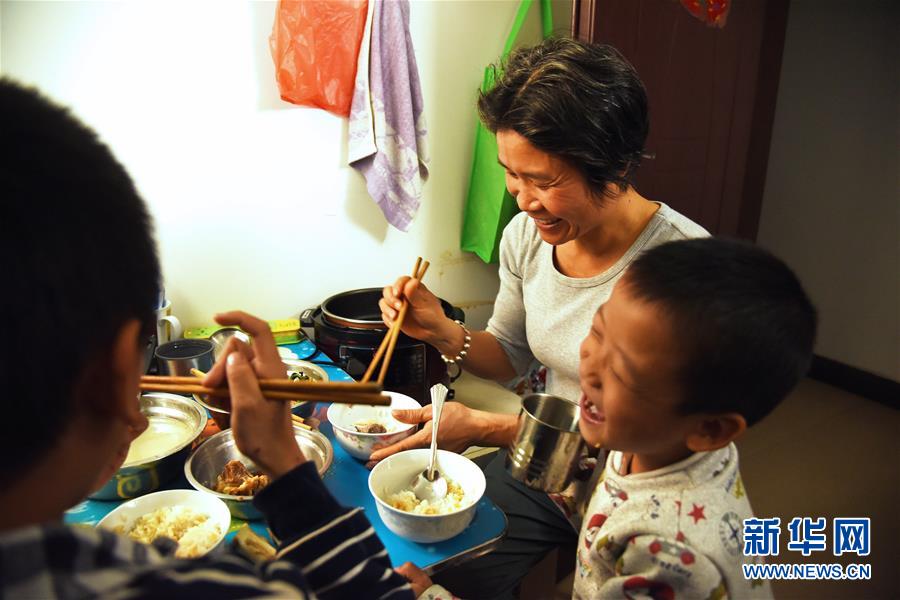 周祝和两个儿子在出租屋里吃饭(1月29日摄)。 新华社记者田建川摄