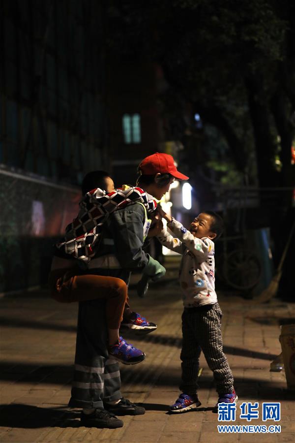 周祝下班后,陈俊宁(右)和陈俊言抢着让妈妈背(1月30日摄)。 新华社记者田建川摄