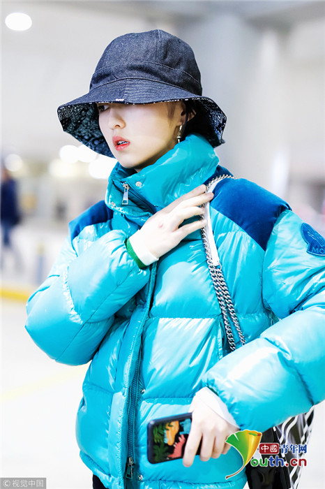 2019年1月31日,上海,张子枫现身机场。她身穿蓝色羽绒服,戴着大檐帽也难挡好气色,雪肤红唇妆容精致展现女人味。