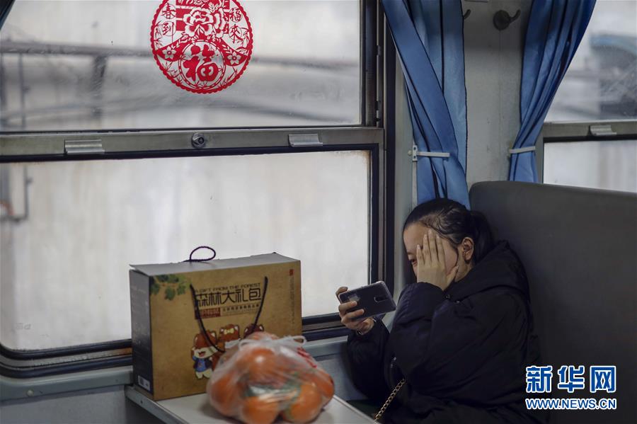 1月31日,在5612次绿皮“小慢车”上,一名女孩带着回家的礼物,与家人视频通话。 新华社记者 刘潺 摄