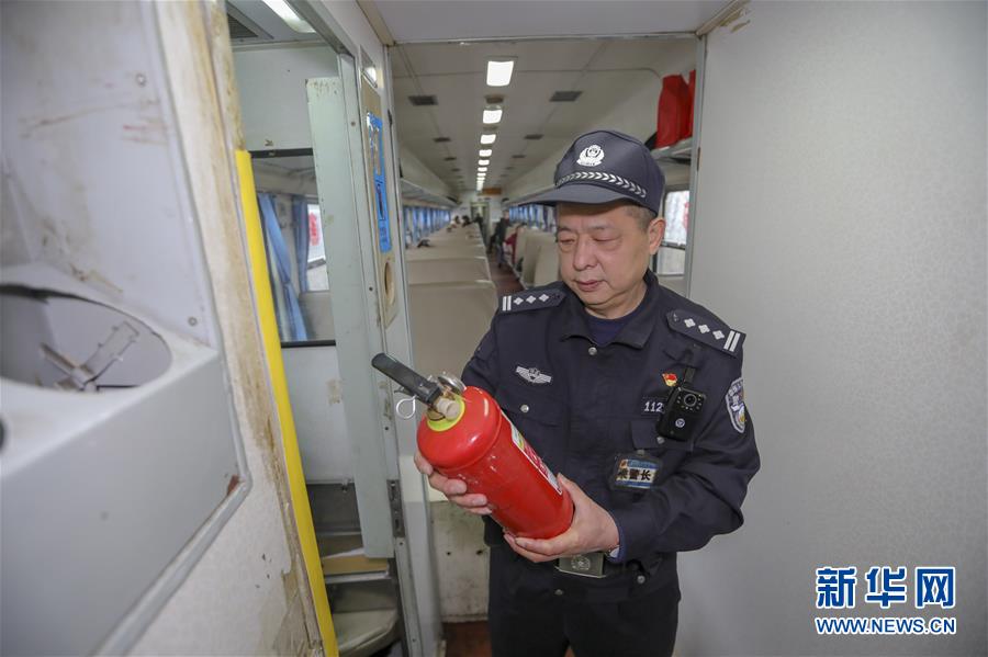 1月31日,在5612次绿皮“小慢车”上,59岁的乘警陈维全在车厢里检查防火设施设备。 新华社记者 刘潺 摄