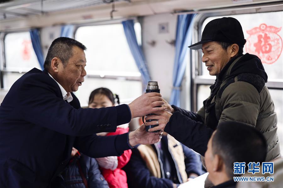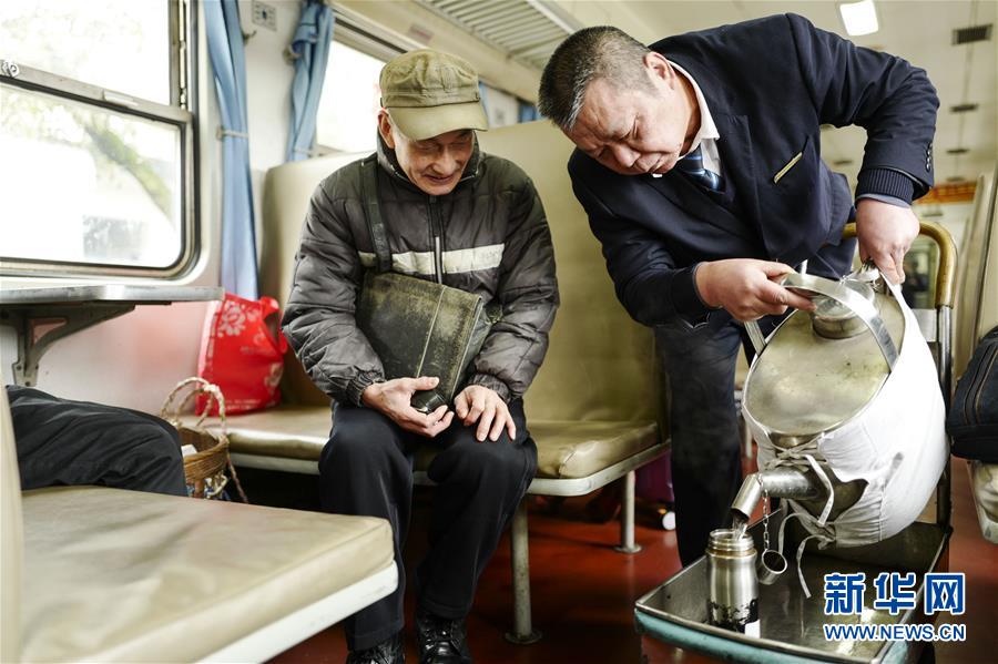 1月31日,在5612次绿皮“小慢车”上,烧水工陈伟(左一)将加满热水的水杯递给乘客。 新华社记者 刘潺 摄