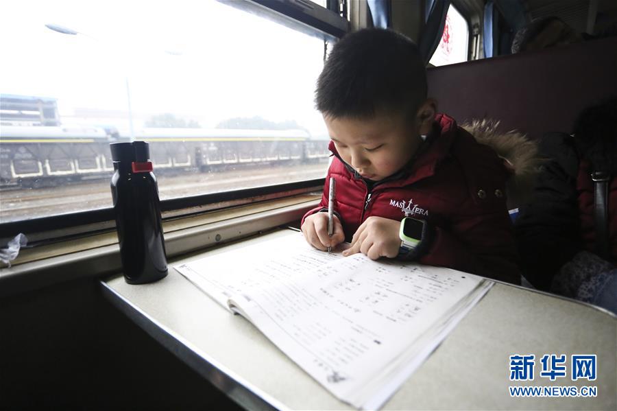 一名小男孩在5612次绿皮“小慢车”上做作业(1月26日摄)。 新华社发(包亮 摄)