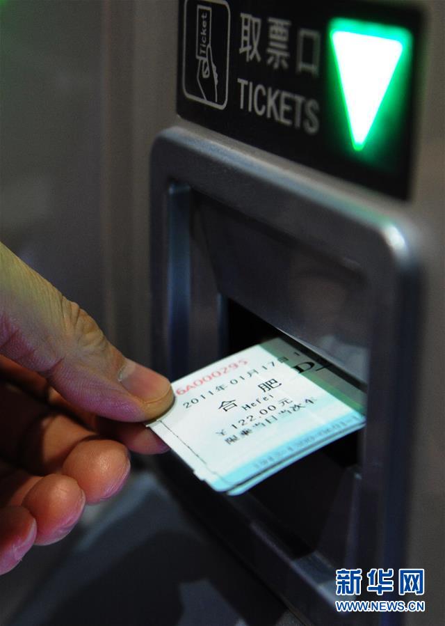一名旅客在合肥火车站自动售票机上提取刚买到的火车票(2011年1月17日摄)。 新华社记者李健摄