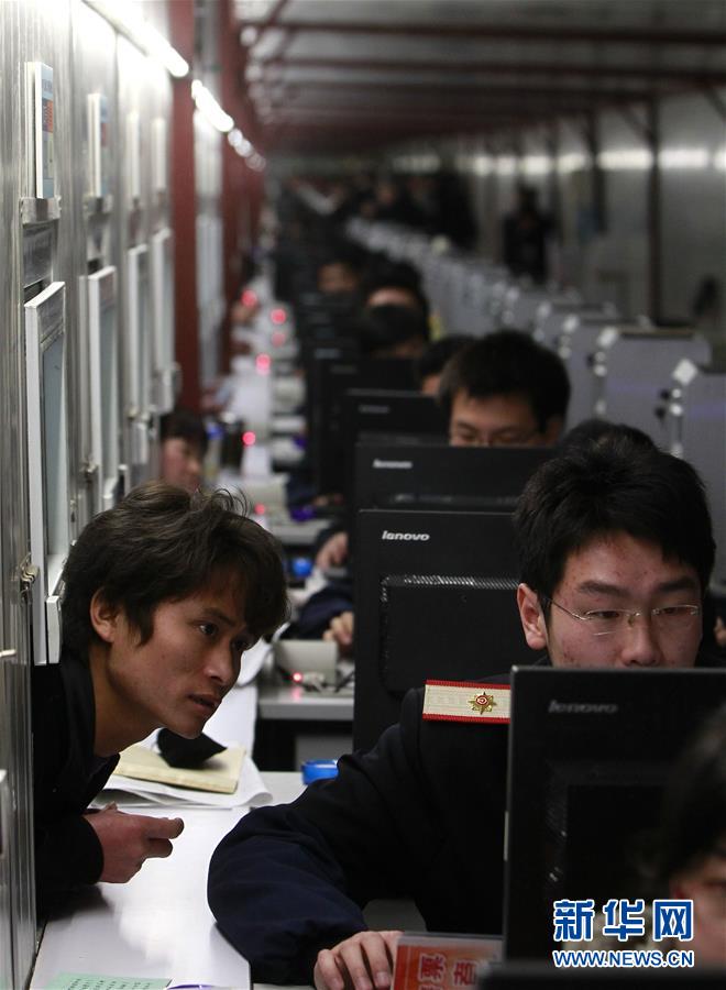 2011年1月9日,上海站北广场春运火车票“大卖场”开辟130个售票窗口,开始发售春运首日车票。这是旅客在火车票“大卖场”购票。 新华社记者裴鑫摄