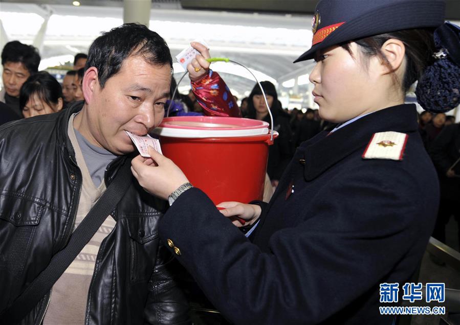 一名旅客在广州南站检票进站(2011年1月19日摄)。 新华社记者陈晔华摄