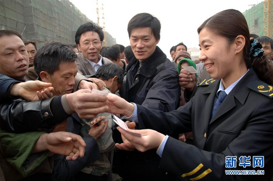 春运期间,济南火车站为农民工提供团体订票服务。这是工作人员在高新区的一处建筑工地送票(2007年2月6日)。 新华社记者徐速绘摄