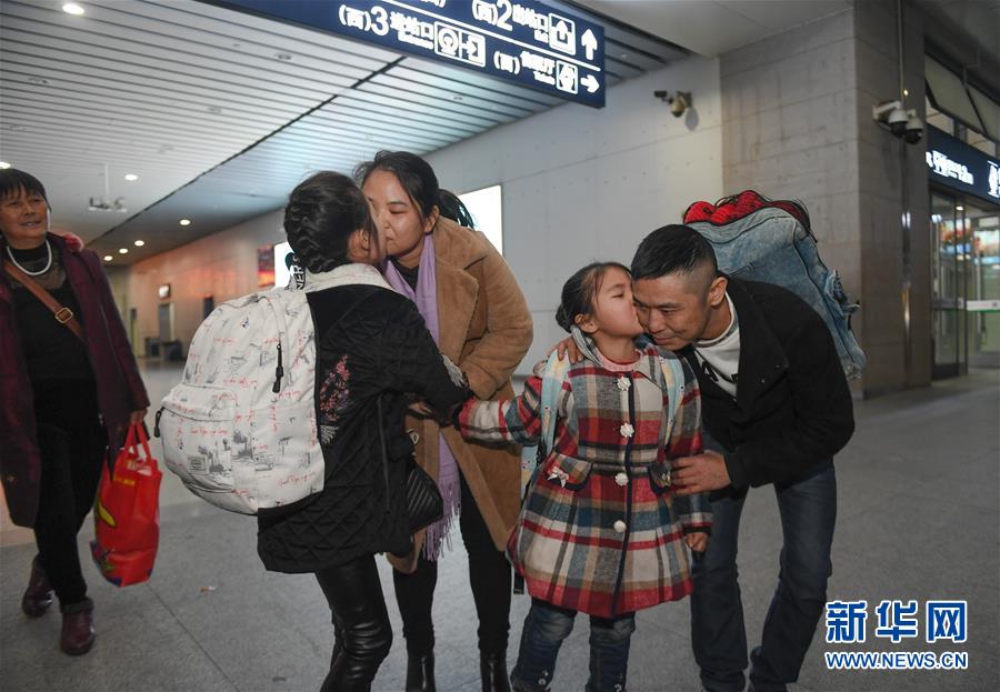 1月24日,在福州南站,黄诗韵(左二)、黄嘉韵(右二)姐妹俩亲吻前来接站的父母。这是黄诗韵、黄嘉韵第一次坐高铁来到福建。 新春佳节临近,春运进入高峰。流动的中国,处处涌动温馨的真情。 年年春运,岁岁不同。今年春运高峰有什么新特点,来往旅客有什么新变化?新华社记者深入火车站、机场、长途汽车站亲身体验。 新华社记者 宋为伟摄