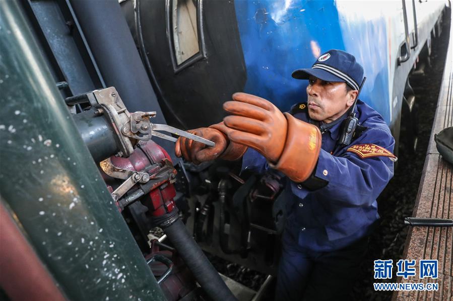 1月22日,结束检查工作后,姚福臣准备爬上站台。 新华社记者 潘昱龙摄