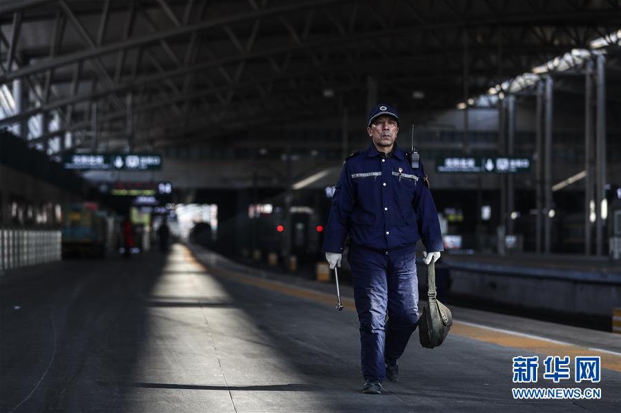 1月22日,姚福臣走在站台上,准备去对一列刚驶入车站的列车进行检查。 新华社记者 潘昱龙摄