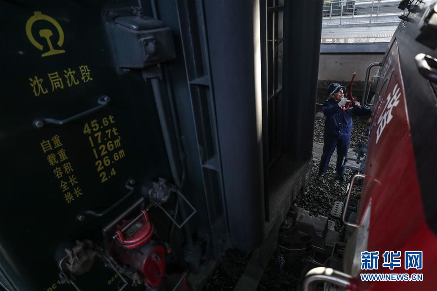 1月22日,姚福臣在指挥车头与车厢进行对接。 新华社记者 潘昱龙摄