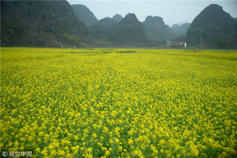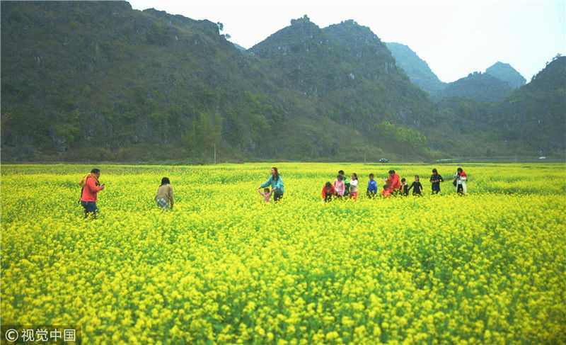2019年2月5日,春节期间,广西来宾市忻城县万余亩油菜花竞相绽放,吸引众多游客前来赏花游玩,感受春天的气息。 近年来,广西忻城县大力实施乡村振兴战略,注重发展乡村旅游产业,把乡村旅游与美丽乡村、脱贫攻坚紧密结合起来,辐射带动当地贫困户脱贫致富。樊绍光/视觉中国
