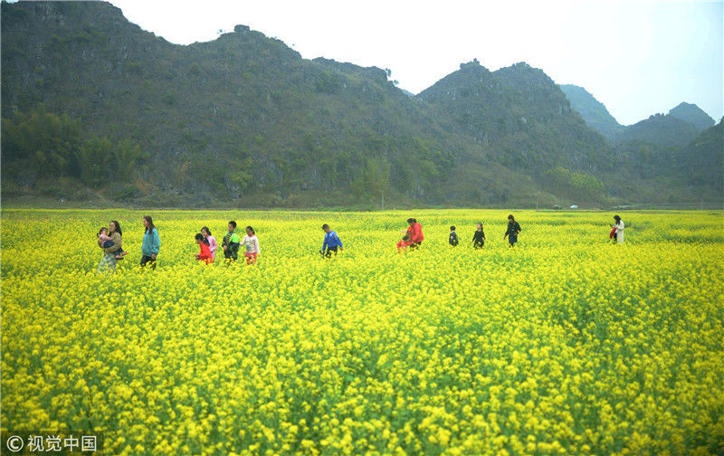 2019年2月5日,广西来宾,当天是农历大年初一,人们在忻城县城关镇隆光村油菜花海中赏花游玩。