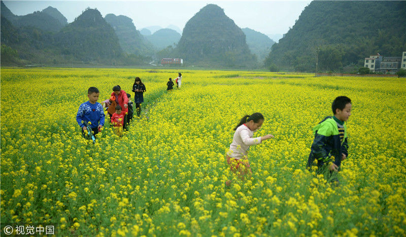 2019年2月5日,广西来宾,当天是农历大年初一,人们在忻城县城关镇隆光村油菜花海中赏花游玩。