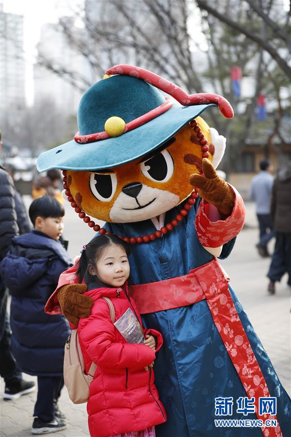 2月5日,在韩国京畿道龙仁市的韩国民俗村,一名中国小朋友和工作人员扮成的玩偶合影。 虽然中国人过春节的传统是返乡回家,但越来越多的国人选择在春节期间走出国门,利用春节假期外出旅游。 新华社记者 王婧嫱 摄
