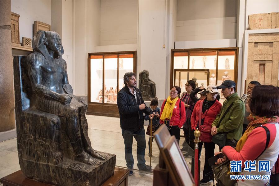 2月9日,在埃及首都开罗,中国游客跟随埃及导游参观埃及博物馆。 虽然中国人过春节的传统是返乡回家,但越来越多的国人选择在春节期间走出国门,利用春节假期外出旅游。 新华社记者 孟涛 摄