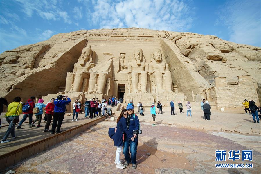 2月7日,在埃及南部阿斯旺省,两名中国游客在阿布·辛拜勒神庙前自拍留影。 虽然中国人过春节的传统是返乡回家,但越来越多的国人选择在春节期间走出国门,利用春节假期外出旅游。 新华社记者 李碧念 摄