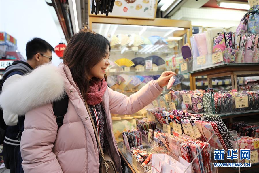 2月8日,在日本东京,中国游客在浅草的商店街选购商品。 虽然中国人过春节的传统是返乡回家,但越来越多的国人选择在春节期间走出国门,利用春节假期外出旅游。 新华社记者 杜潇逸 摄