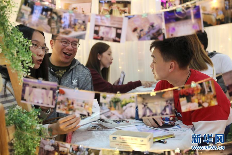 2月10日,一对年轻人(左)在展览上咨询。 新华社记者 吴晓初 摄