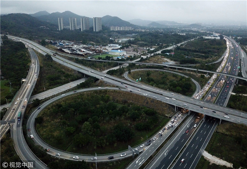 2019年2月9日,大广高速机场北立交回广州方向的车道上车辆排成长龙,与其他空旷的车道形成鲜明对比。马强/南方都市报/视觉中国