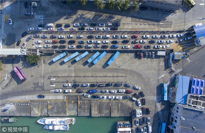 2019年2月9日,航拍在海口秀英港码头排队等待上船的车辆。春节长假即将结束,海南海口三大港口迎来返程客流高峰。骆云飞(海南分社)/中新社/视觉中国