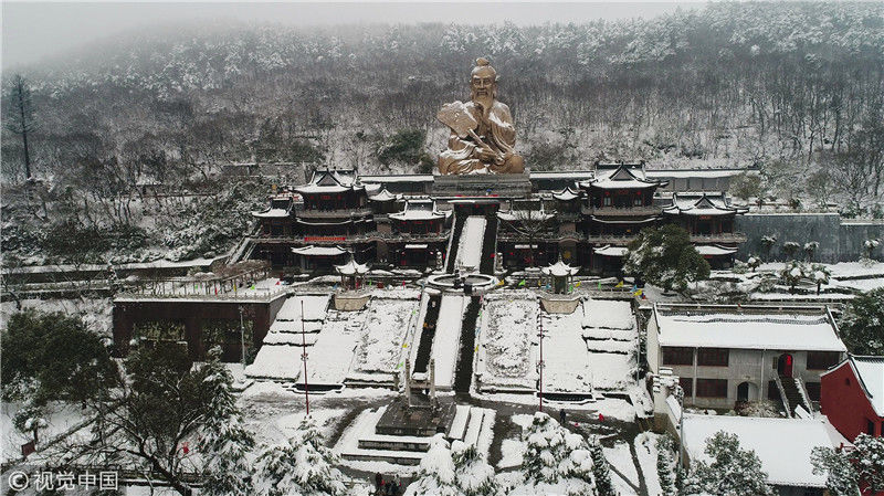 2019年2月11日,江苏镇江,从空中俯瞰茅山,皑皑白雪将整个茅山风景区装扮一新。高33米的老子神像静坐在半山腰的元符万宁宫北侧,换上银装的“老子神像”在雪中显得更加的神秘。万凌云/视觉中国
