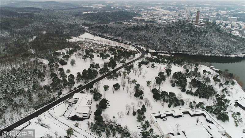 2019年2月11日,江苏镇江,从空中俯瞰茅山,皑皑白雪将整个茅山风景区装扮一新。高33米的老子神像静坐在半山腰的元符万宁宫北侧,换上银装的“老子神像”在雪中显得更加的神秘。