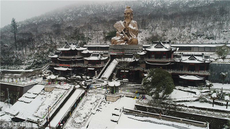 江苏镇江33米高“老子神像”披银装 茅山群峰山林美若画