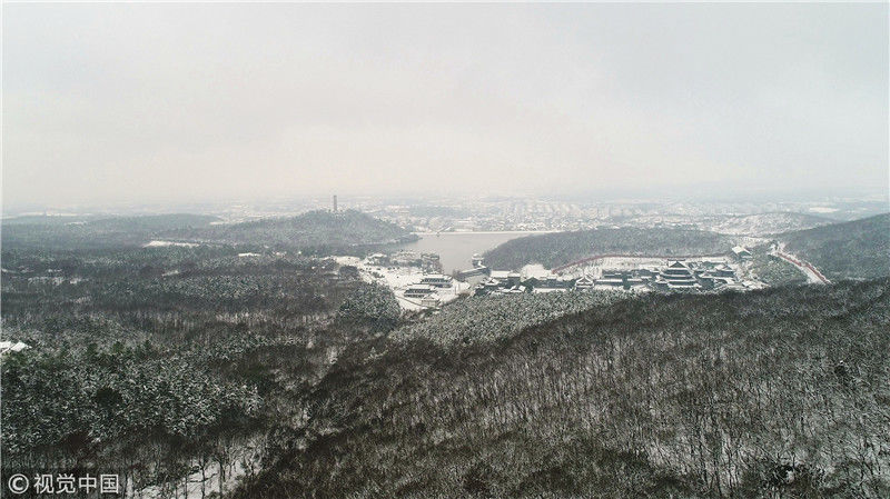 2019年2月11日,江苏镇江,从空中俯瞰茅山,皑皑白雪将整个茅山风景区装扮一新。高33米的老子神像静坐在半山腰的元符万宁宫北侧,换上银装的“老子神像”在雪中显得更加的神秘。