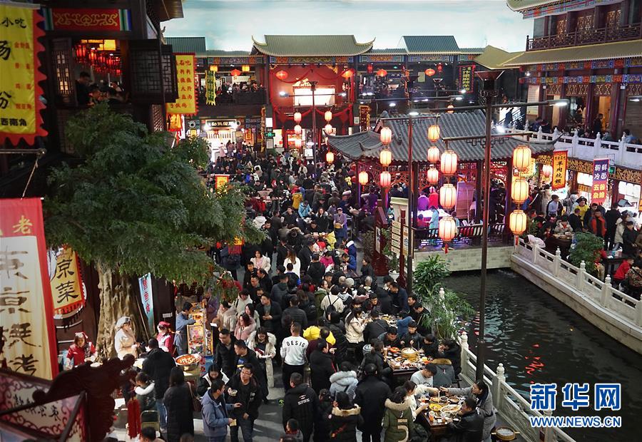 游客在河南省开封市小宋城内品尝小吃(2月7日摄)。新华社记者李安摄
